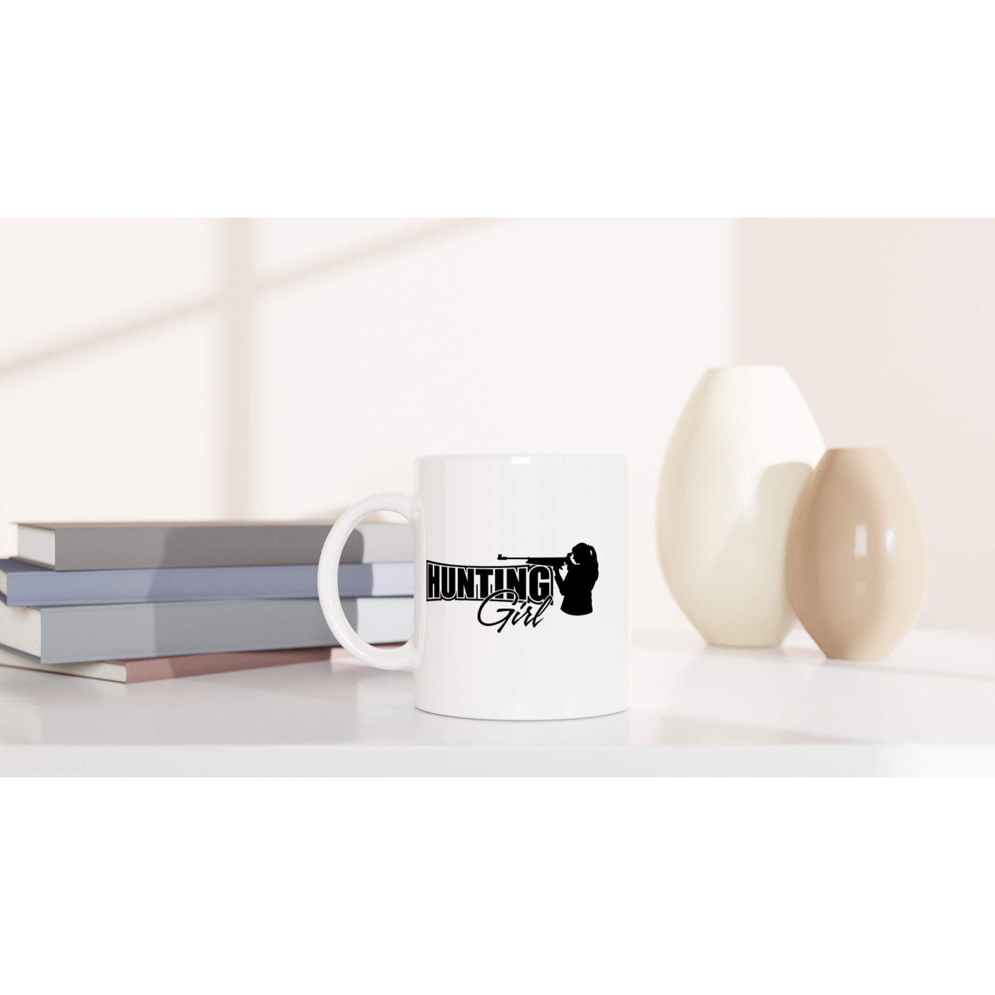 Hunting Girl Hunting Coffee Mug B. This beautiful ceramic mug is perfect for any event of the day. Your morning coffee, a hot chocolate, or any other hot beverage you enjoy. The mug is glossy white and the prints come out beautifully and vividly on it. The print retains its quality and luster when used in both microwaves and the dishwasher.