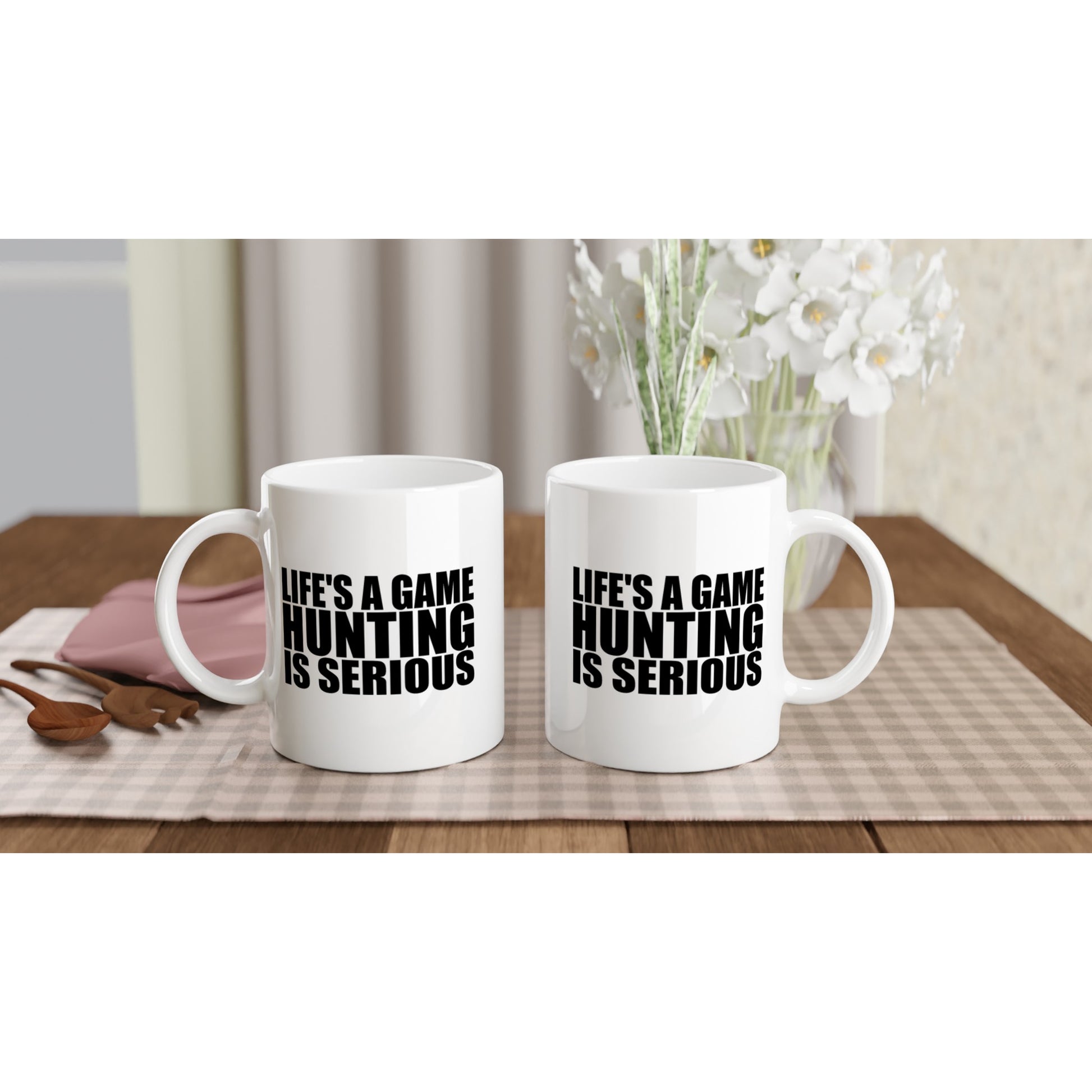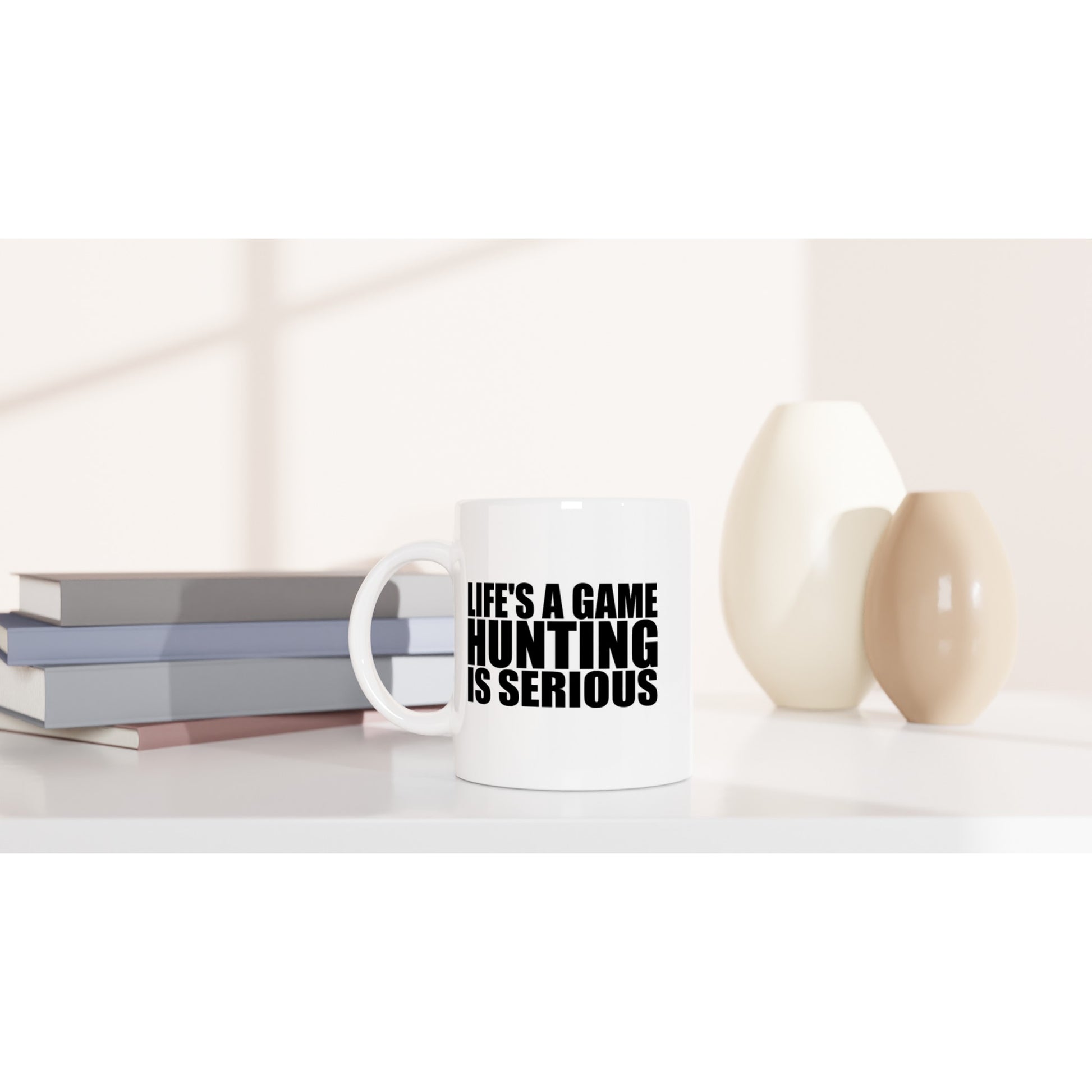 Life's A Game Hunting Is Serious Hunting Coffee Mug. This beautiful ceramic mug is perfect for any event of the day. Your morning coffee, a hot chocolate, or any other hot beverage you enjoy. The mug is glossy white and the prints come out beautifully and vividly on it. The print retains its quality and luster when used in both microwaves and the dishwasher.