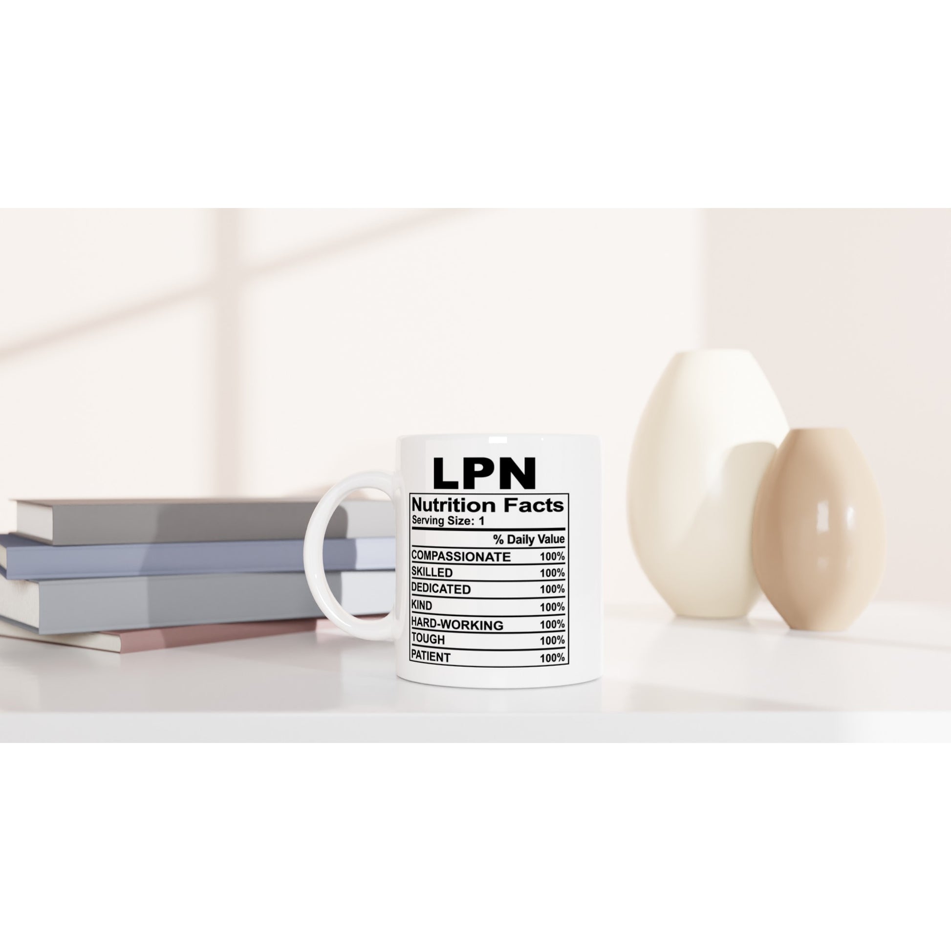 LPN nutrition facts Nursing Nurse Medical Coffee Mug. This beautiful ceramic mug is perfect for any event of the day. Your morning coffee, a hot chocolate, or any other hot beverage you enjoy. The mug is glossy white and the prints come out beautifully and vividly on it. The print retains its quality and luster when used in both microwaves and the dishwasher.
