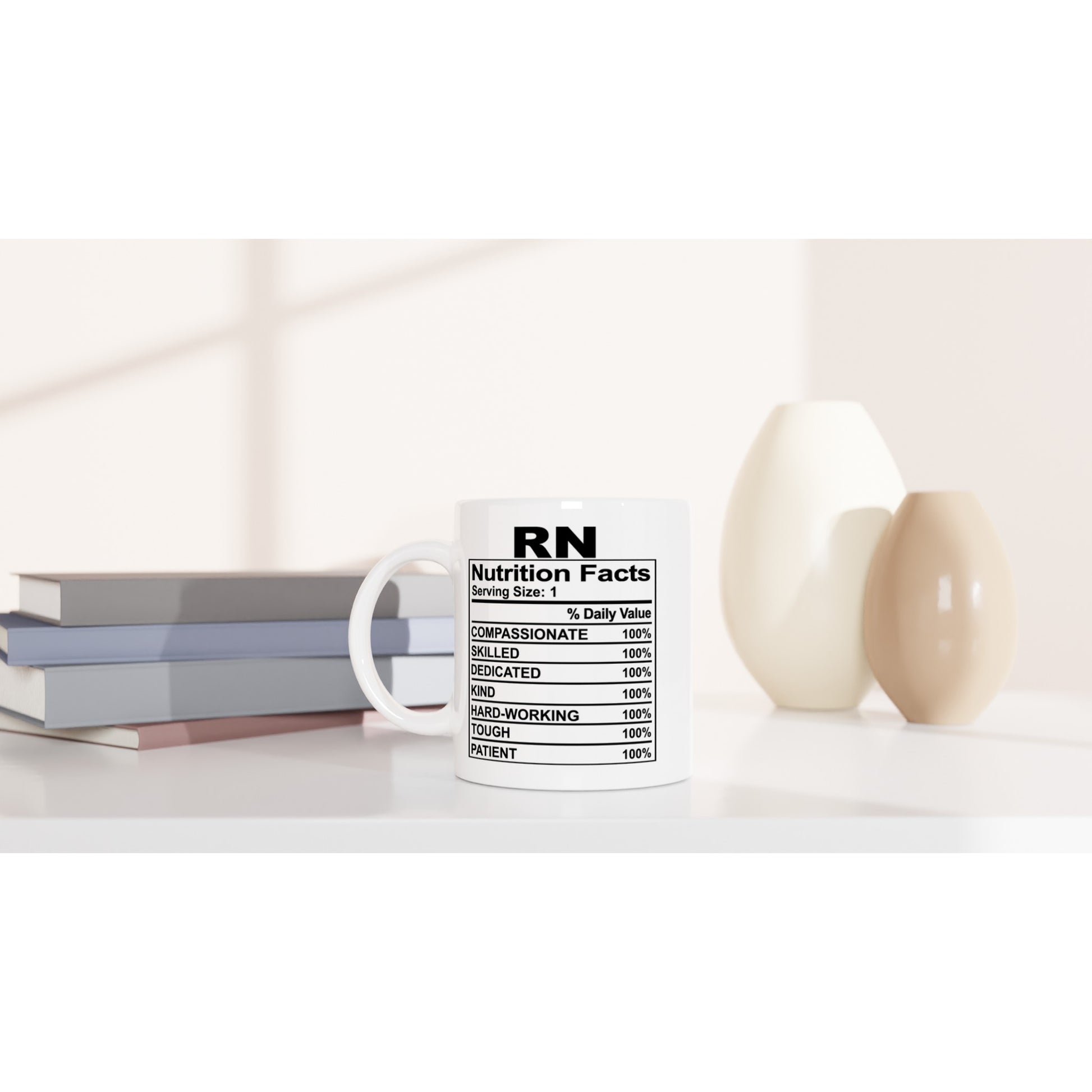 RN nutrition facts Nursing Nurse Medical Coffee Mug. This beautiful ceramic mug is perfect for any event of the day. Your morning coffee, a hot chocolate, or any other hot beverage you enjoy. The mug is glossy white and the prints come out beautifully and vividly on it. The print retains its quality and luster when used in both microwaves and the dishwasher.