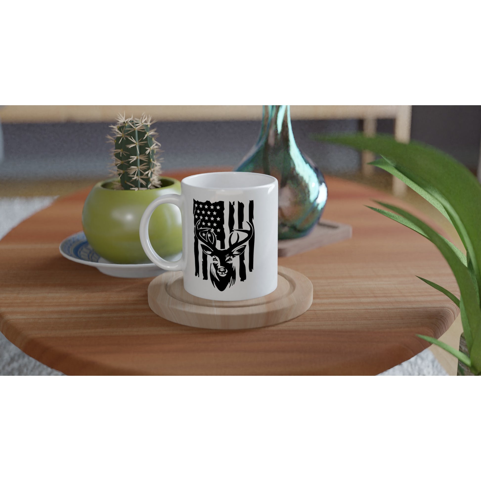 US Flag Deer Hunting Coffee Mug B. This beautiful ceramic mug is perfect for any event of the day. Your morning coffee, a hot chocolate, or any other hot beverage you enjoy. The mug is glossy white and the prints come out beautifully and vividly on it. The print retains its quality and luster when used in both microwaves and the dishwasher.