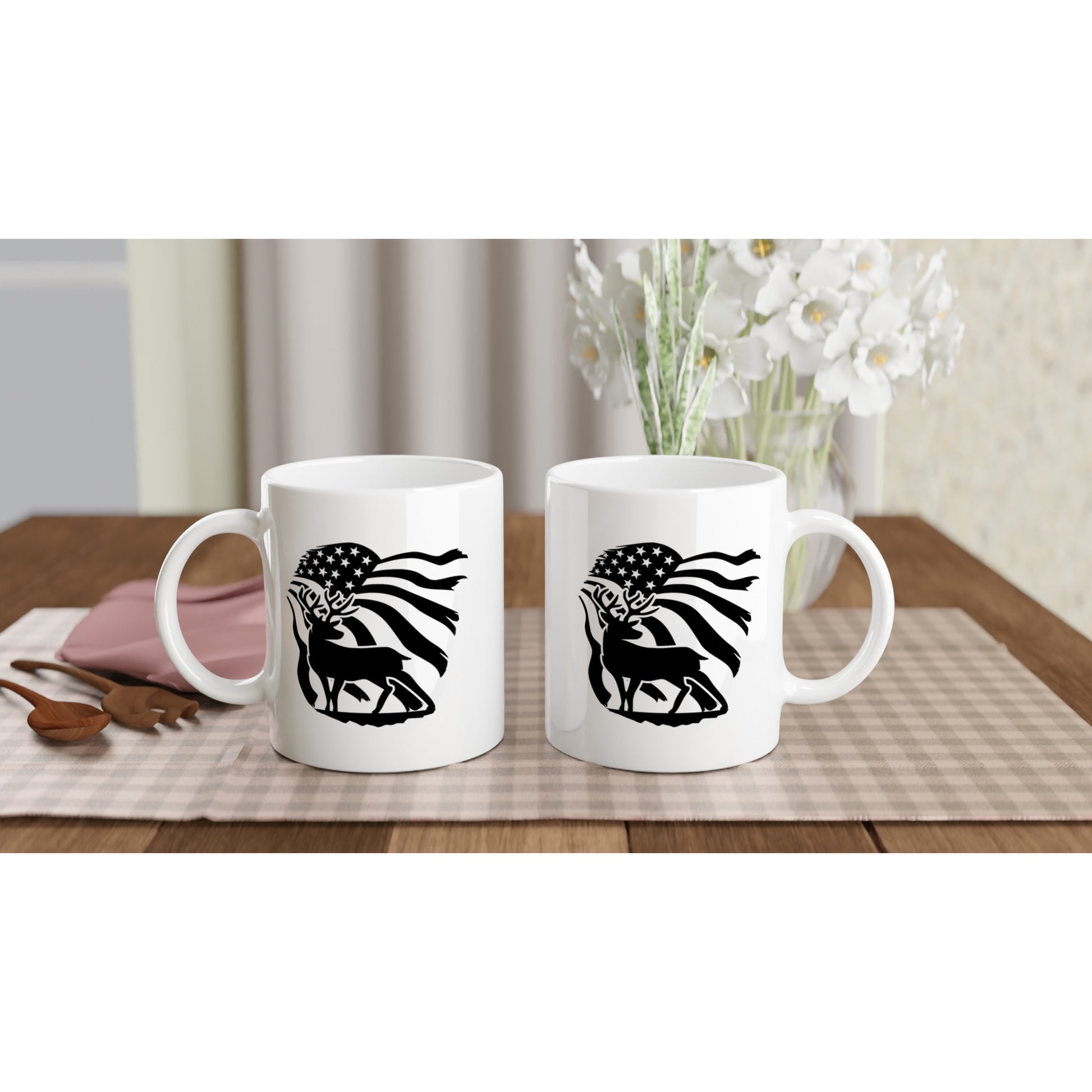 US Flag Deer Hunting Coffee Mug D. This beautiful ceramic mug is perfect for any event of the day. Your morning coffee, a hot chocolate, or any other hot beverage you enjoy. The mug is glossy white and the prints come out beautifully and vividly on it. The print retains its quality and luster when used in both microwaves and the dishwasher.