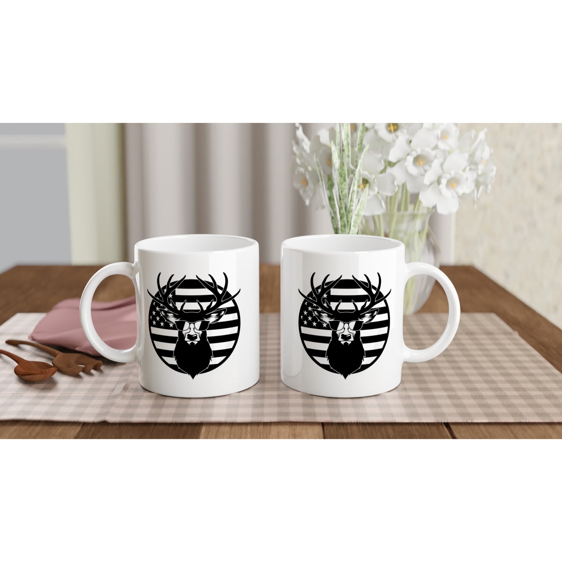 US Flag Deer Sunglasses Hunting Coffee Mug. This beautiful ceramic mug is perfect for any event of the day. Your morning coffee, a hot chocolate, or any other hot beverage you enjoy. The mug is glossy white and the prints come out beautifully and vividly on it. The print retains its quality and luster when used in both microwaves and the dishwasher.