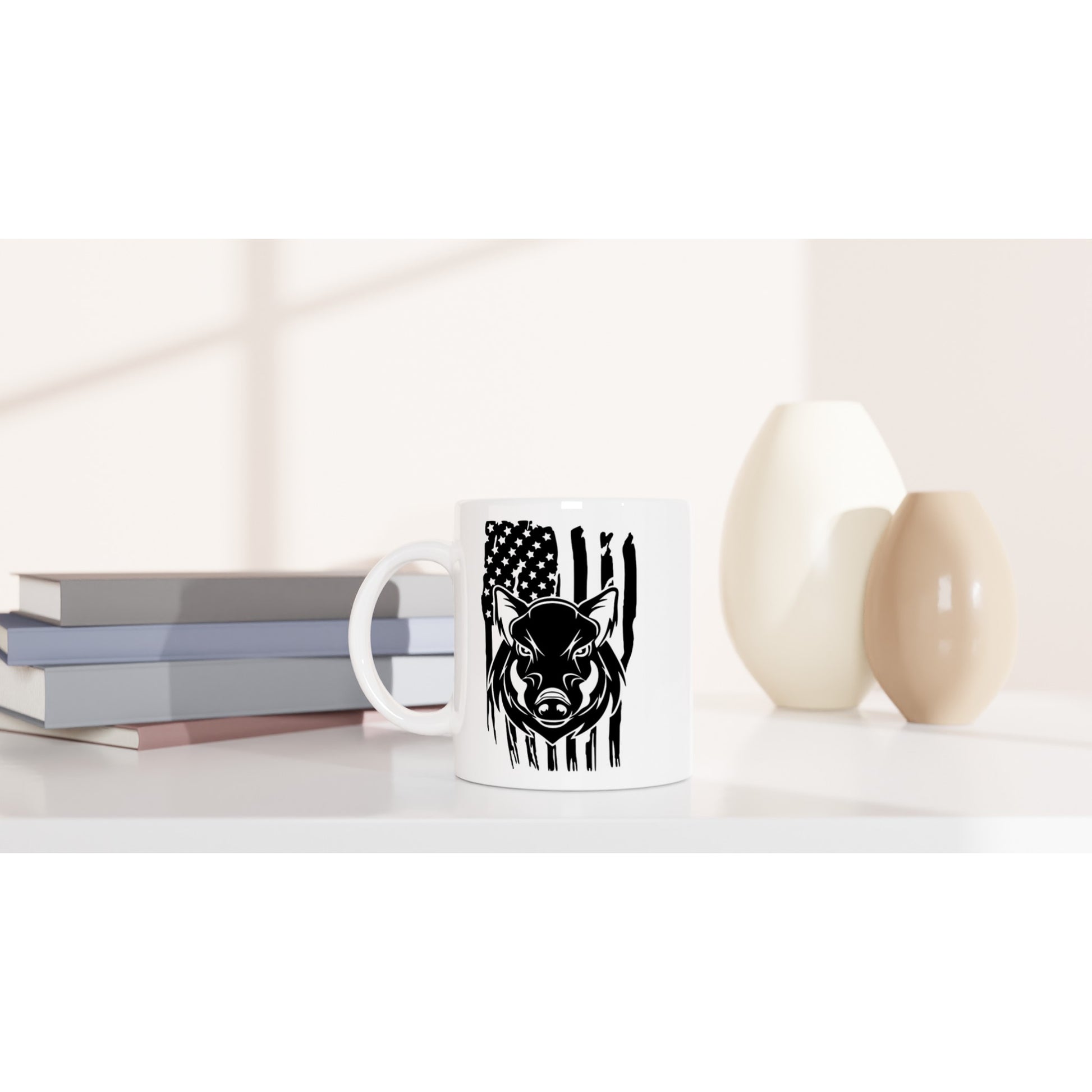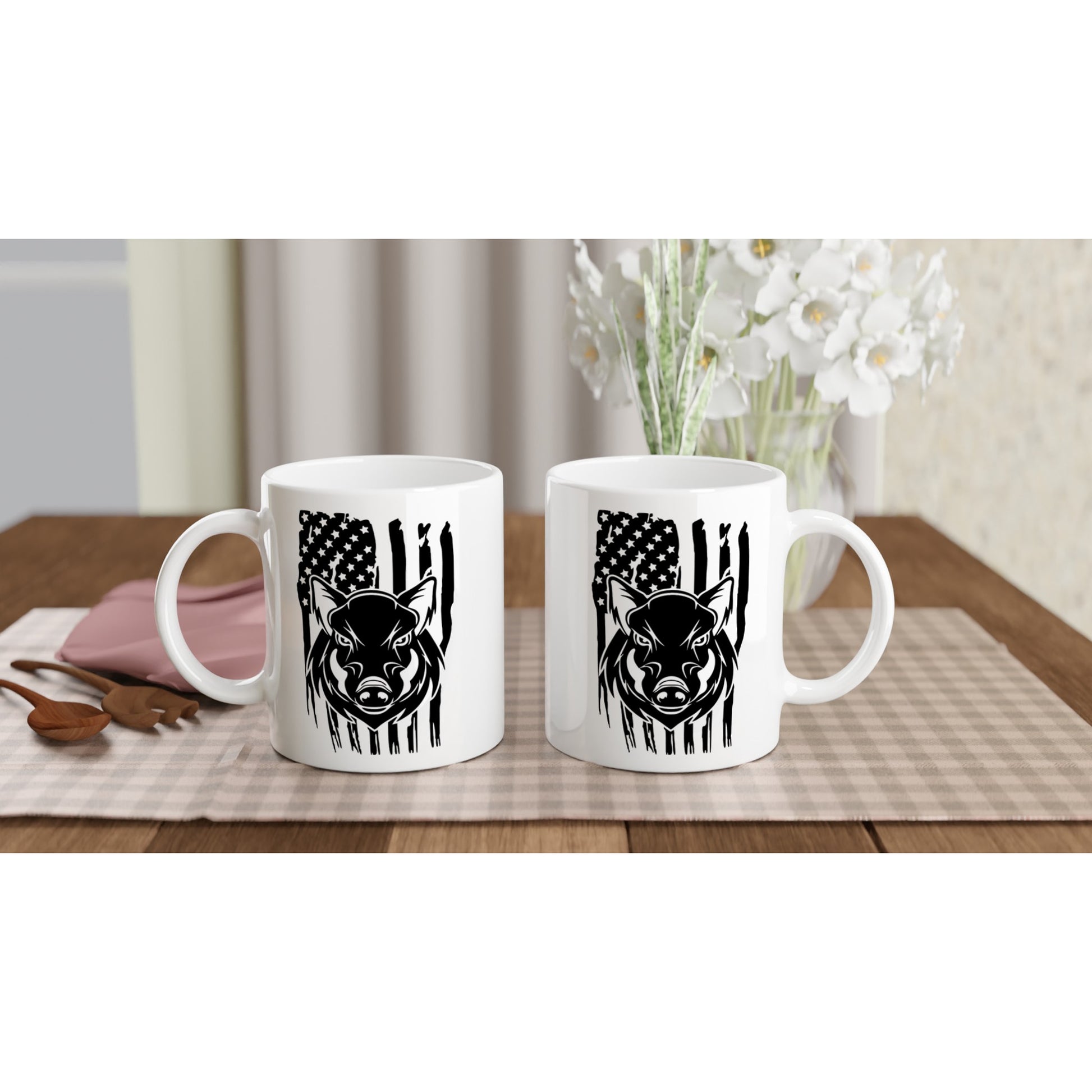 US Flag Hog Hunting Coffee Mug. This beautiful ceramic mug is perfect for any event of the day. Your morning coffee, a hot chocolate, or any other hot beverage you enjoy. The mug is glossy white and the prints come out beautifully and vividly on it. The print retains its quality and luster when used in both microwaves and the dishwasher.